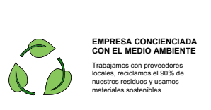 Trabajamos con proveedores locales, reciclamos el 90% de nuestros residuos y usamos materiales sostenibles